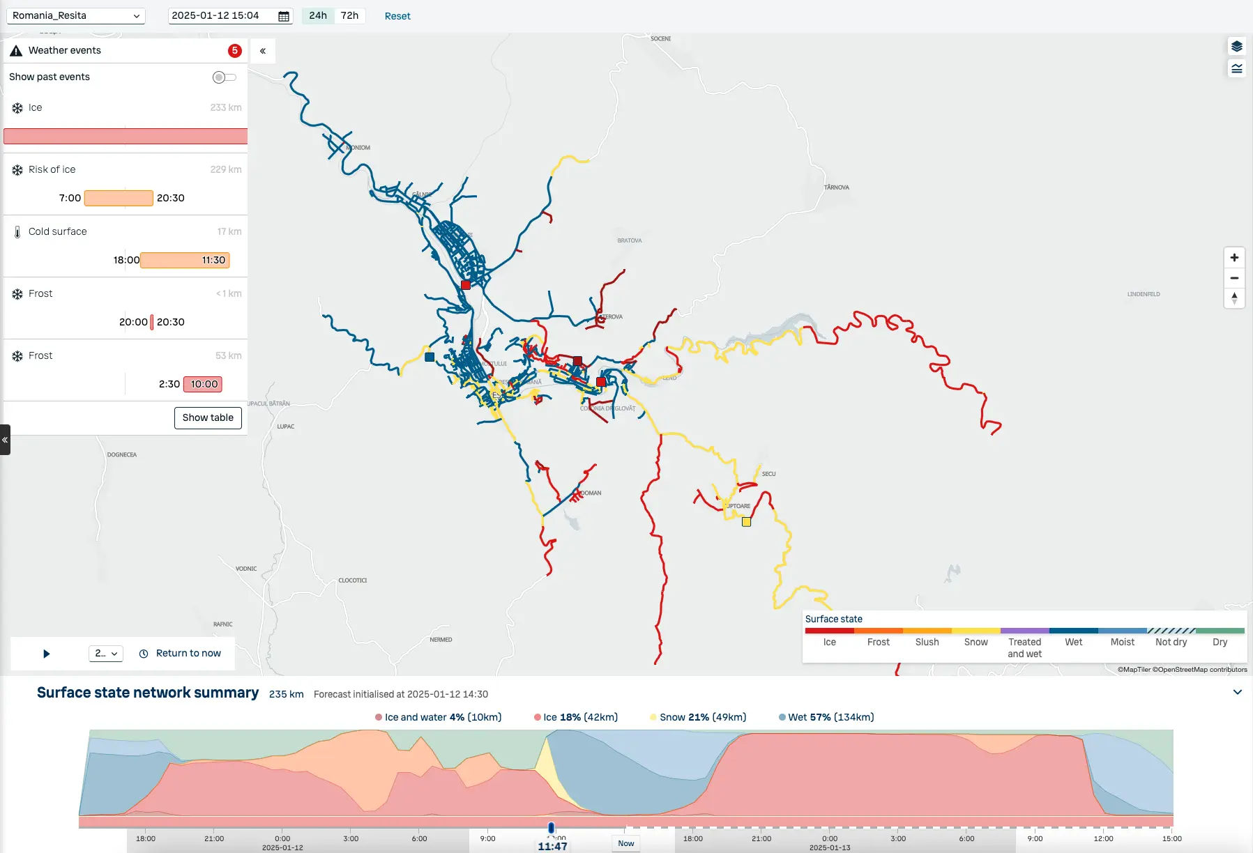 Astazi, tehnologia senzorilor și modelele avansate de prognoză Vaisala vă permit să aveți o imagine completă asupra stării drumului – în timp real, în fiecare punct, de-a lungul tuturor drumurilor din rețea.