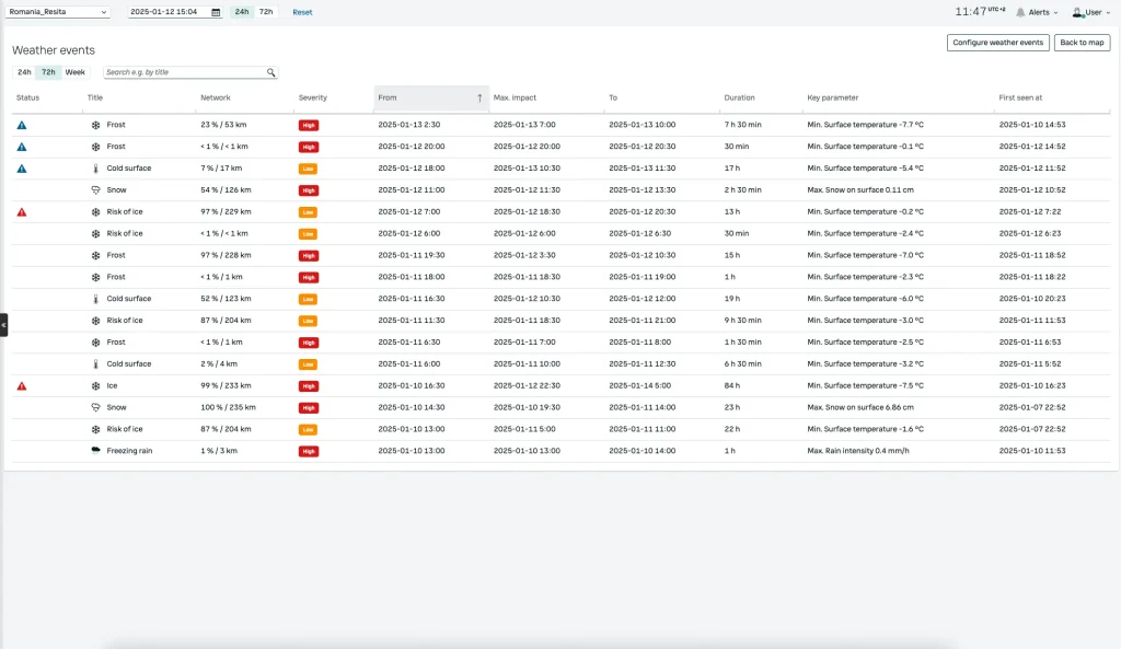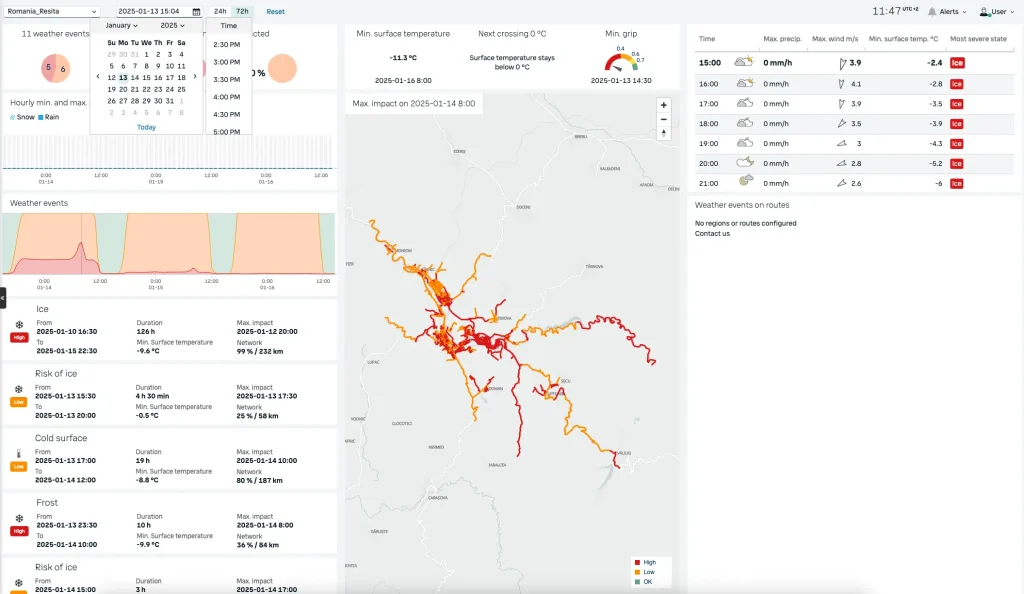 Platforma afiseaza pe harta conditiile curente si pe cele prognozate ale carosabilului, inclusiv temperatura suprafeței, umiditatea si riscul de formare a ghetii.